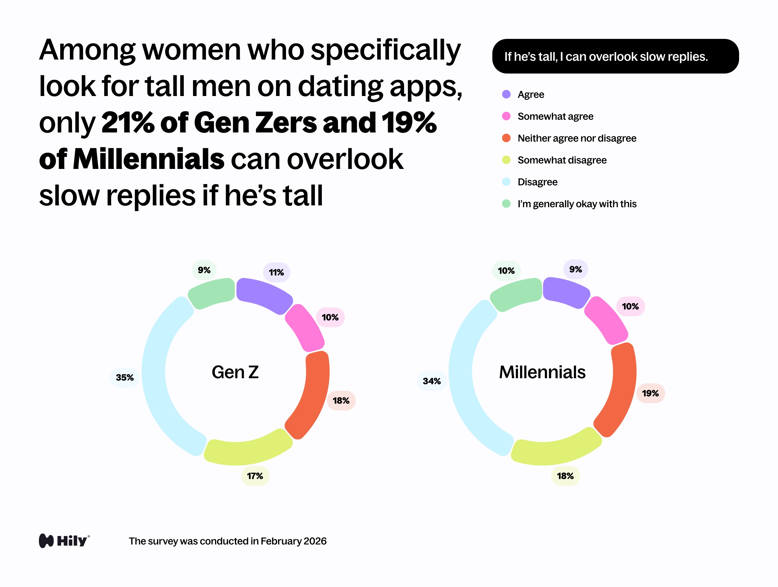 - Among women who specifically look for tall men on dating apps, only 21% of Gen Zers and 19% of Millennials can overlook slow replies if he’s tall.