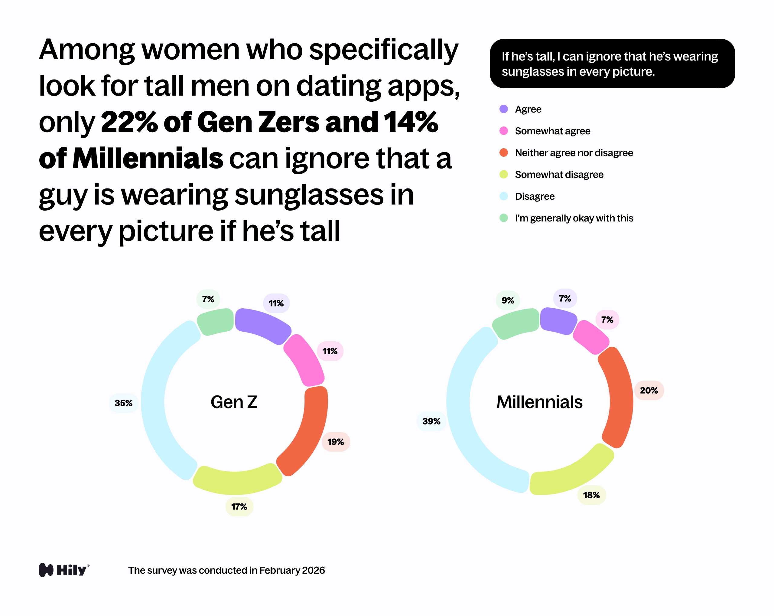 22% of Gen Z and 14% of Millennials are okay (and 7% of Gen Z and 9% of Millennials are generally okay) with always-sunglasses pics, even if he’s tall. Eyes are the window to the soul, so shades on in every photo? Height can’t hide that.