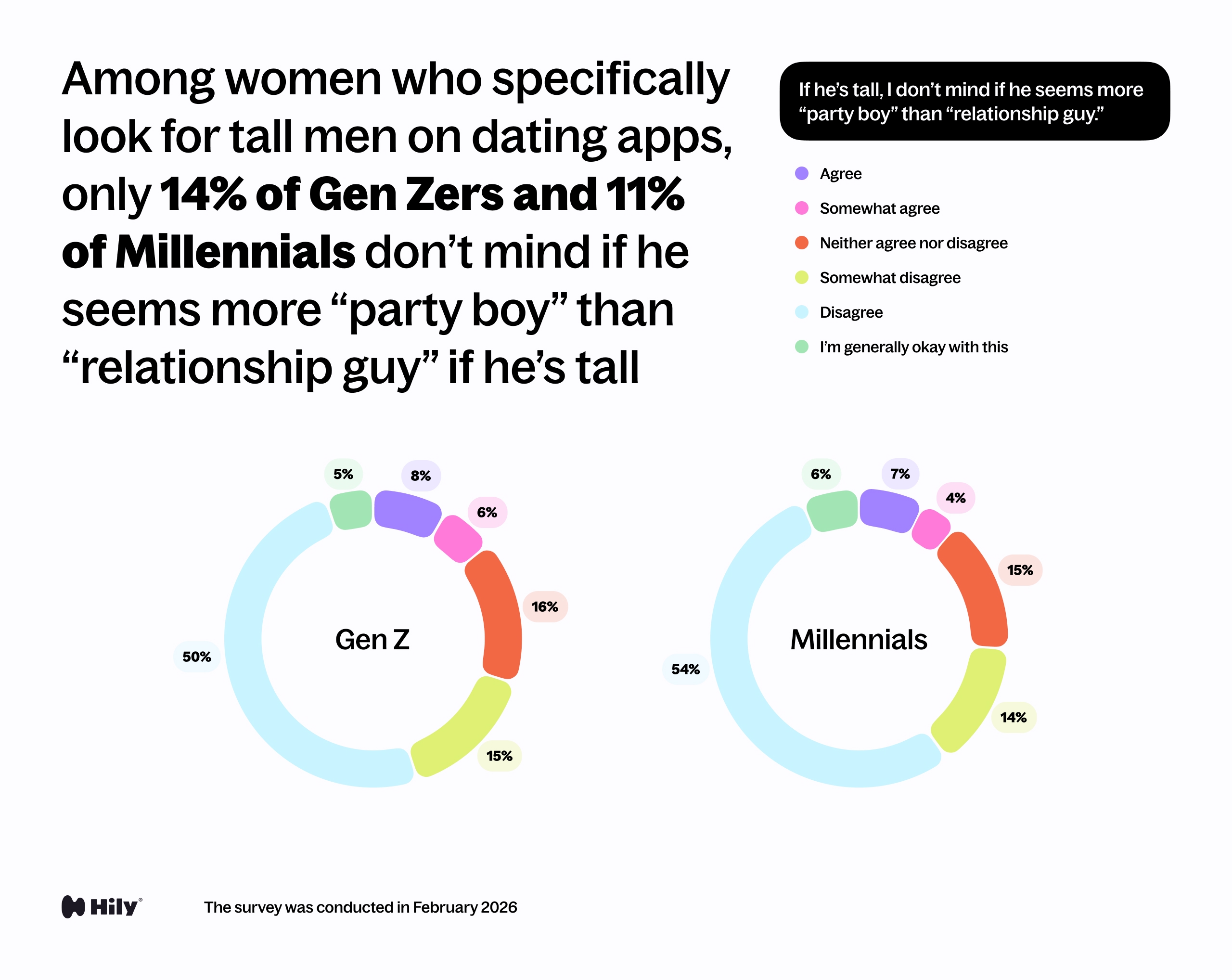 Personality cues and lifestyle compatibility still matter — and here, tall doesn’t help much. Only 5% of Gen Z and 6% of Millennials are generally okay with (and 14% of Gen Z and 11% of Millennials are okay with) party boy energy if he’s tall. Party boy energy doesn’t get a free pass, even at 6’2”.