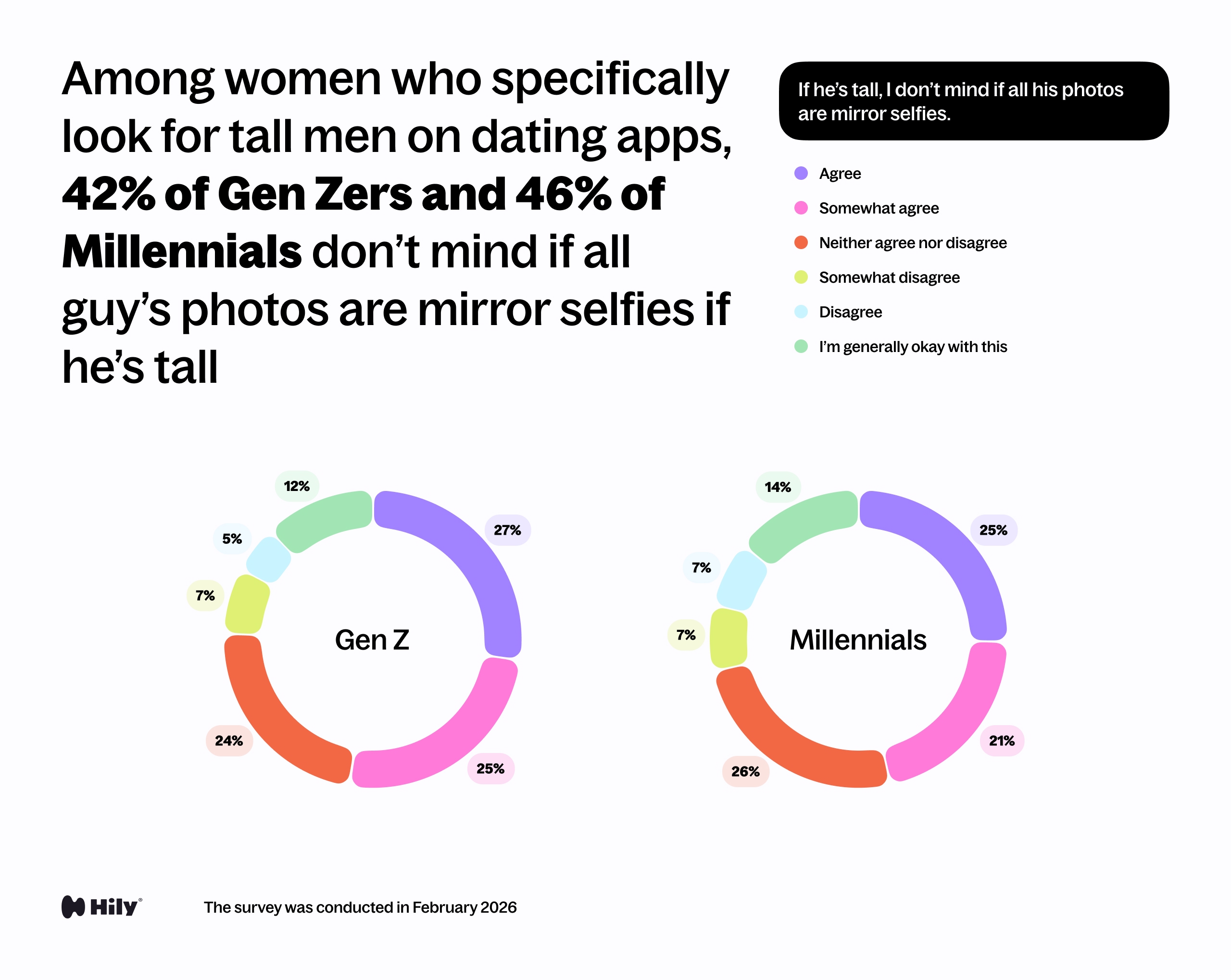 Mirror selfies aren’t automatically a red flag. 42% of Gen Z and 46% of Millennials are okay with only mirror selfies as long as he’s tall, while 12% of Gen Z and 14% of Millennials are only generally okay with this.