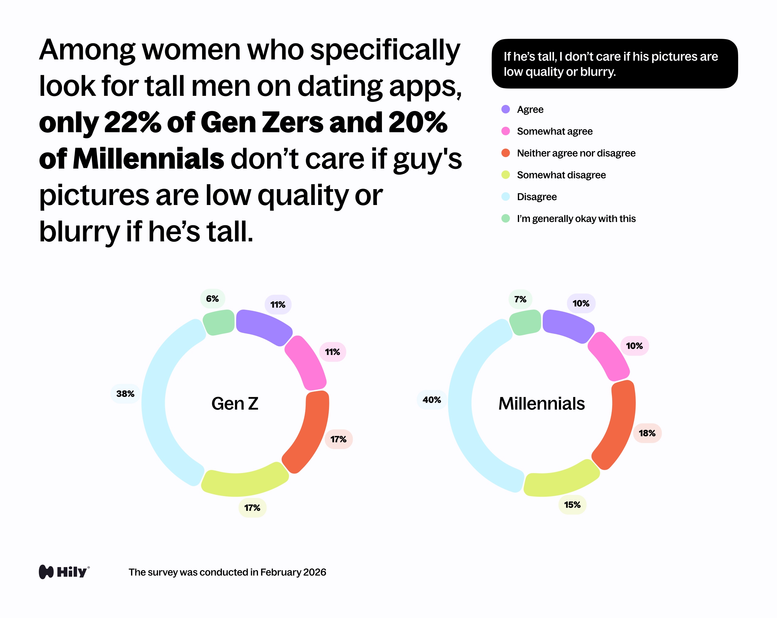 Clear pics still matter; you might be tall enough to impress, but not tall enough to excuse everything. Only 22% of Gen Z and 20% of Millennials are okay–and even fewer are generally okay (6% Gen Z and 7% Millennial)–with blurry, low-quality photos, even if he’s tall.