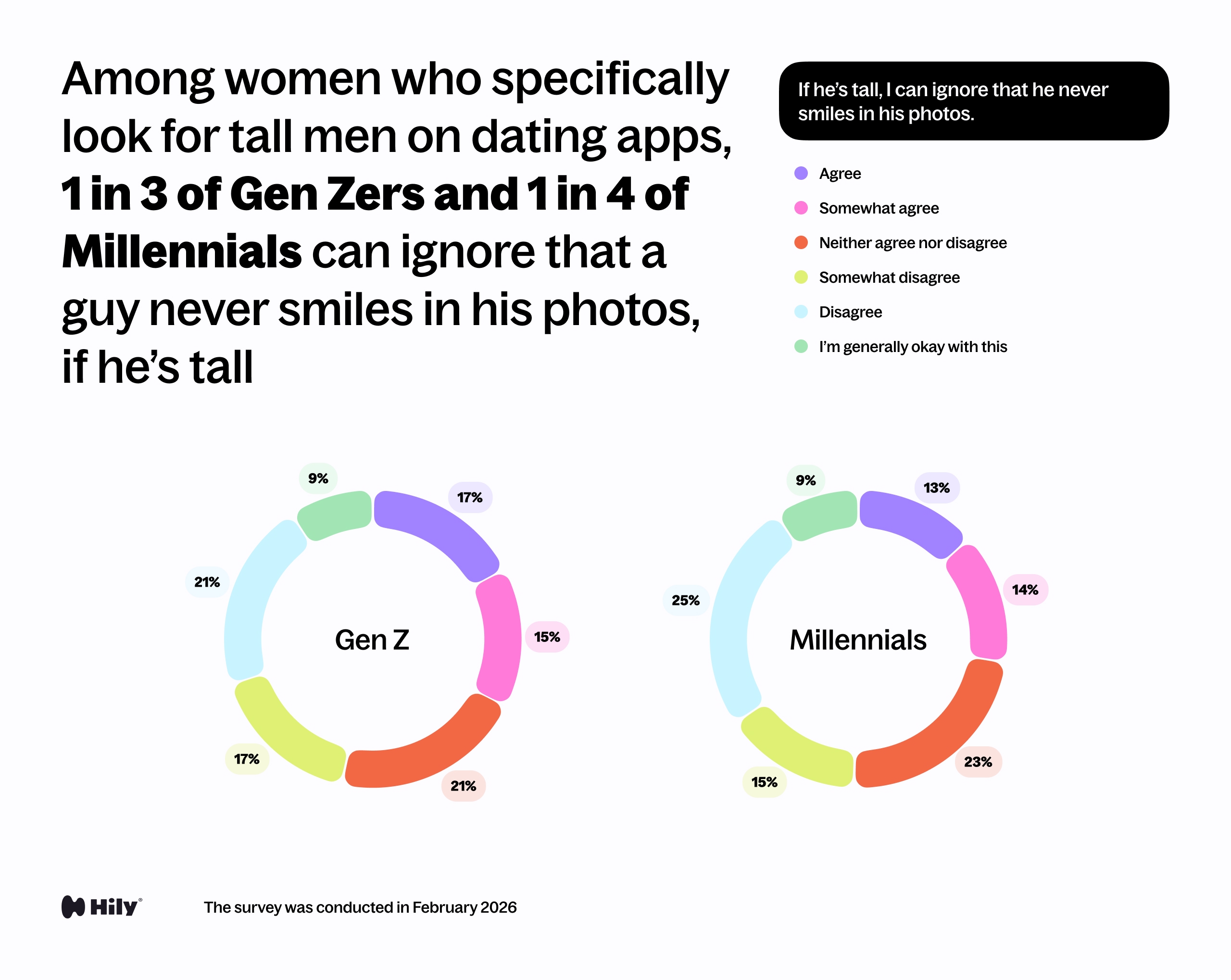 1 in 3 Gen Z women and 1 in 4 Millennials can ignore a guy that doesn’t smile in his photos as long as he’s tall, while only 9% of surveyed women are generally okay with it. Height doesn’t matter as much if the personality isn’t there.