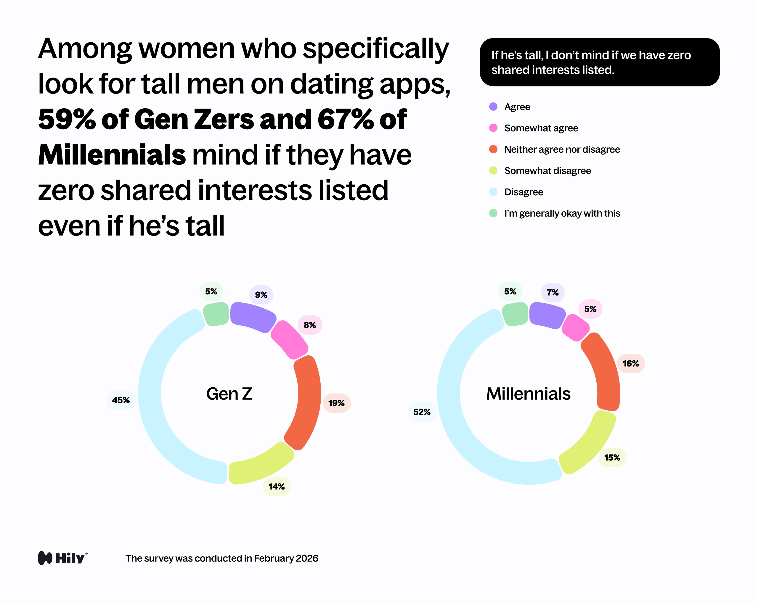 Height matters for many: 58% of Gen Z women and 54% of Millennials say they’re specifically looking for a tall guy when on the app. That preference is common, but what it means in practice varies by generation.